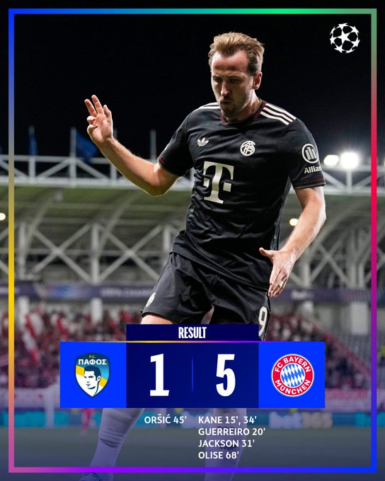 在这样一场实力差距悬殊的比赛中,拜仁无疑又是通过不到半场的时间所锁定胜利且结束悬念、而到了下半场也只是走过场的方式,拿到了更终的胜利--凭借凯恩的梅开二度和格雷罗,雅克松以及奥丽塞的进球,南大王客场5-1轻取帕福斯拿到两连胜。