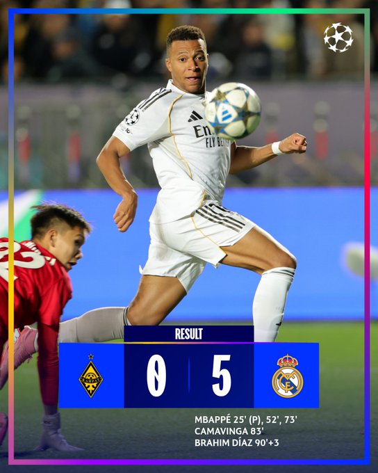 在本场比赛中,姆巴佩成为了皇马远征哈萨克斯坦的取胜更大功臣--凭借法国球星的帽子戏法和卡马文加以及迪亚斯的进球,皇马在客场5球大战欧冠新军,拿到了本赛季的欧冠两连胜!