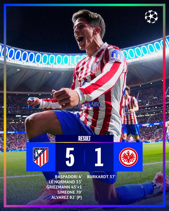 继上周的马德里德比5-2的比分击溃了皇马之后,马竞的状态看上去得到了延续--在主场对阵法兰克福的比赛中,凭借格列兹曼,阿尔瓦雷斯等5位球员的进球,马竞主场5-1大胜法兰克福更终拿到了本赛季欧冠的第一胜。