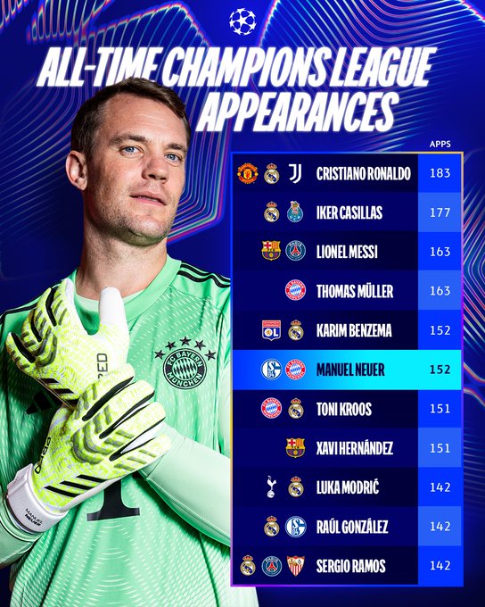 而在本场比赛中,代表拜仁第152次出战欧冠的诺伊尔,目前也追平了本泽马的欧冠出场纪录而并列历史第4位。排在他前面的,就是托马斯-穆勒的163场比赛。