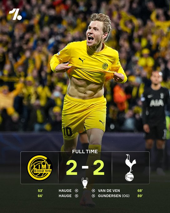 当海于格在下半场的13分钟之内梅开二度之际,所有人或许都以为博德闪耀能在主场击退上赛季的欧联冠军从而拿到一场胜利。然而,范德芬的进球和更后时刻甘德森的乌龙,更终让热刺在客场幸运收获了平局的不败结果。