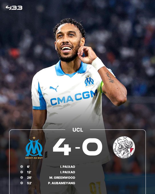 凭借派尚,格林伍德和奥巴梅杨的进球,马赛主场4球完胜阿贾克斯取得了本场的更终胜利!