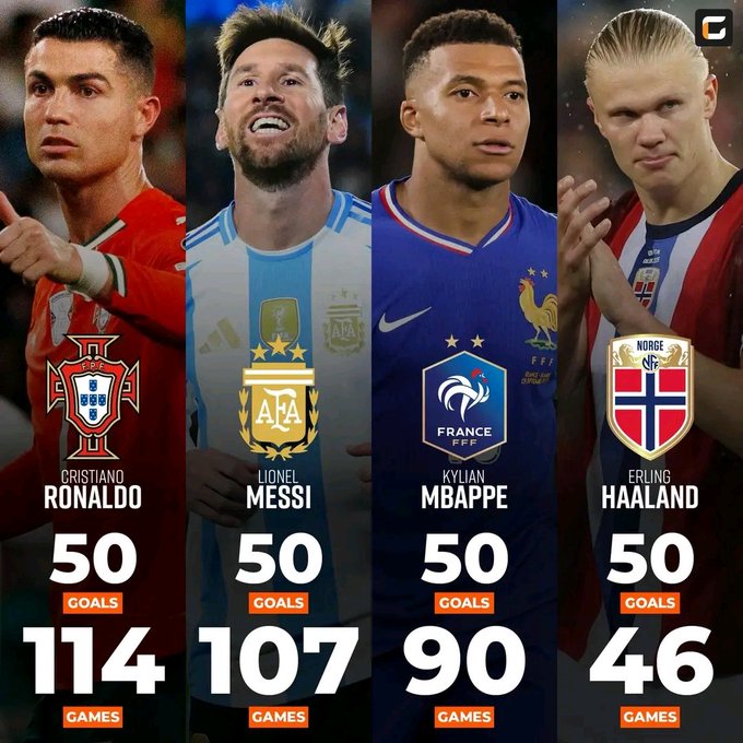 哈兰德的效率除却超过了前辈以外,其实也远远领先于一直和他有竞争的姆巴佩--据统计,姆巴佩代表法国队打进50球所用场次为90场,几乎是哈兰德46场的两倍!