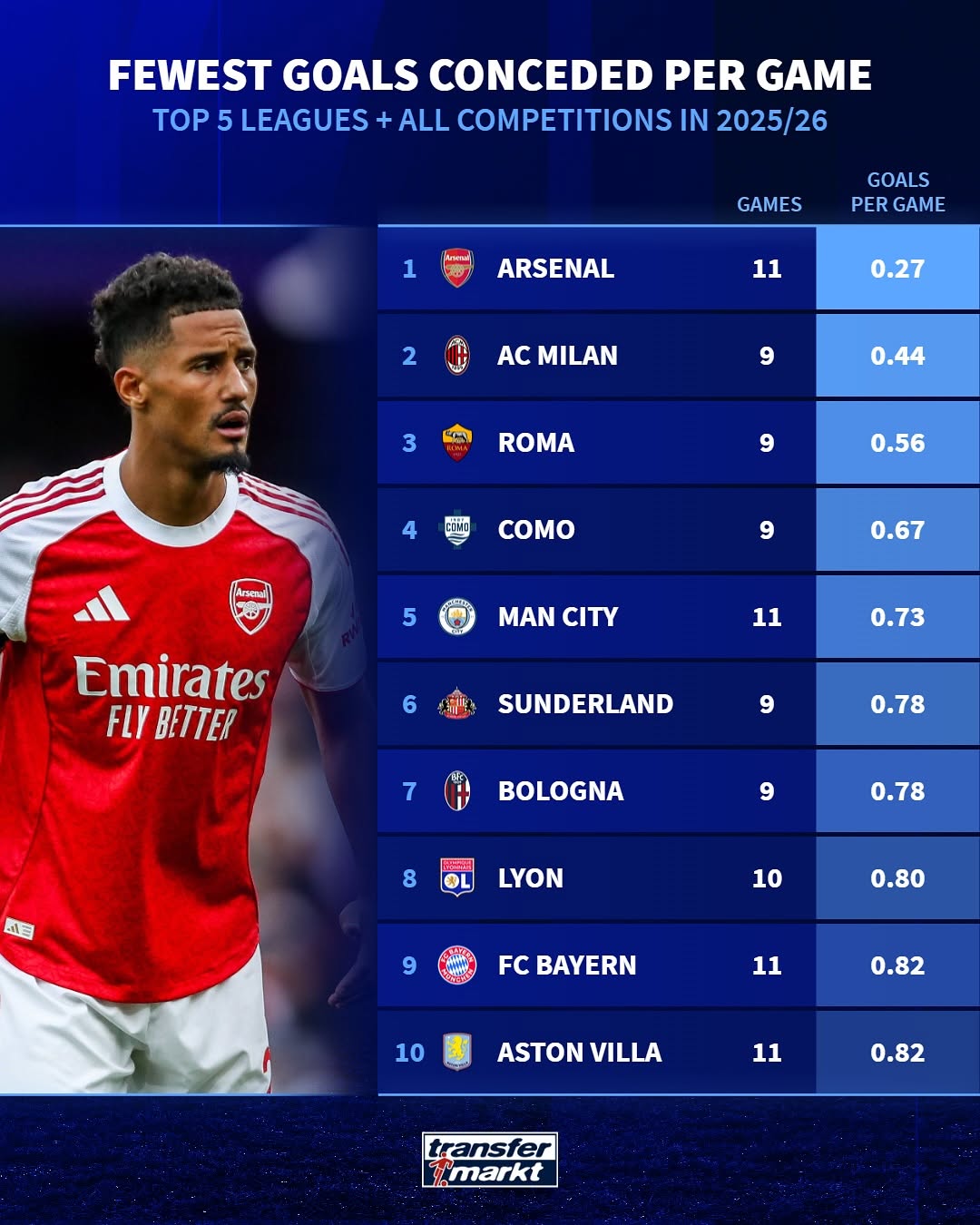25/26赛季场均失球排名: