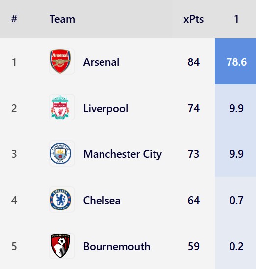 在Football Meets Data的更新英超预测中,阿森纳的夺冠概率已经达到了78.6%而凸显了其巨大的优势,而积分的预测也已经达到了至少84分(领先身后的利物浦和曼城有望达到至少10分的分差)。