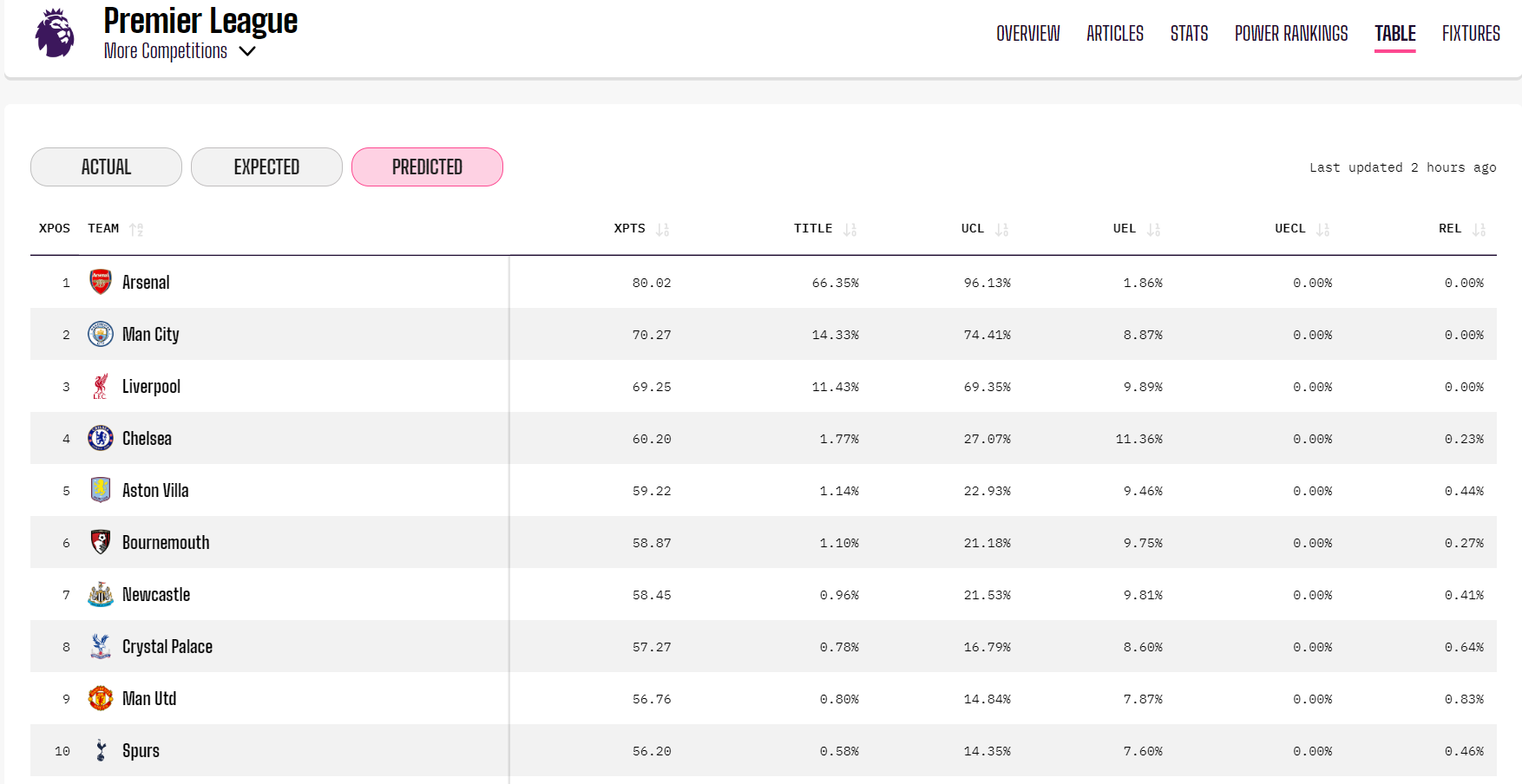 不止是Squawka,在Opta的更新预测中,阿森纳同样排名第一位--夺冠概率高达66.35%而预测积分将达到80分的情形,无疑已经让阿森纳对比他们的老对手曼城和利物浦有了相当明显的差距。