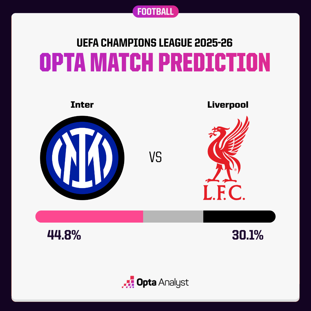并且在Opta的预测中,更多的支持也还是给予了主队--国米胜,44.8%;利物浦胜,30.1%;双方平局,25.1%。