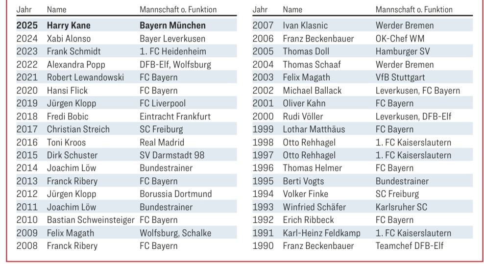 随着25/26赛季德甲联赛前15轮的结束而进入了本赛季的冬歇期之后,德国媒体《踢球者》杂志也按照惯例发布了本年度的年度人物代表。