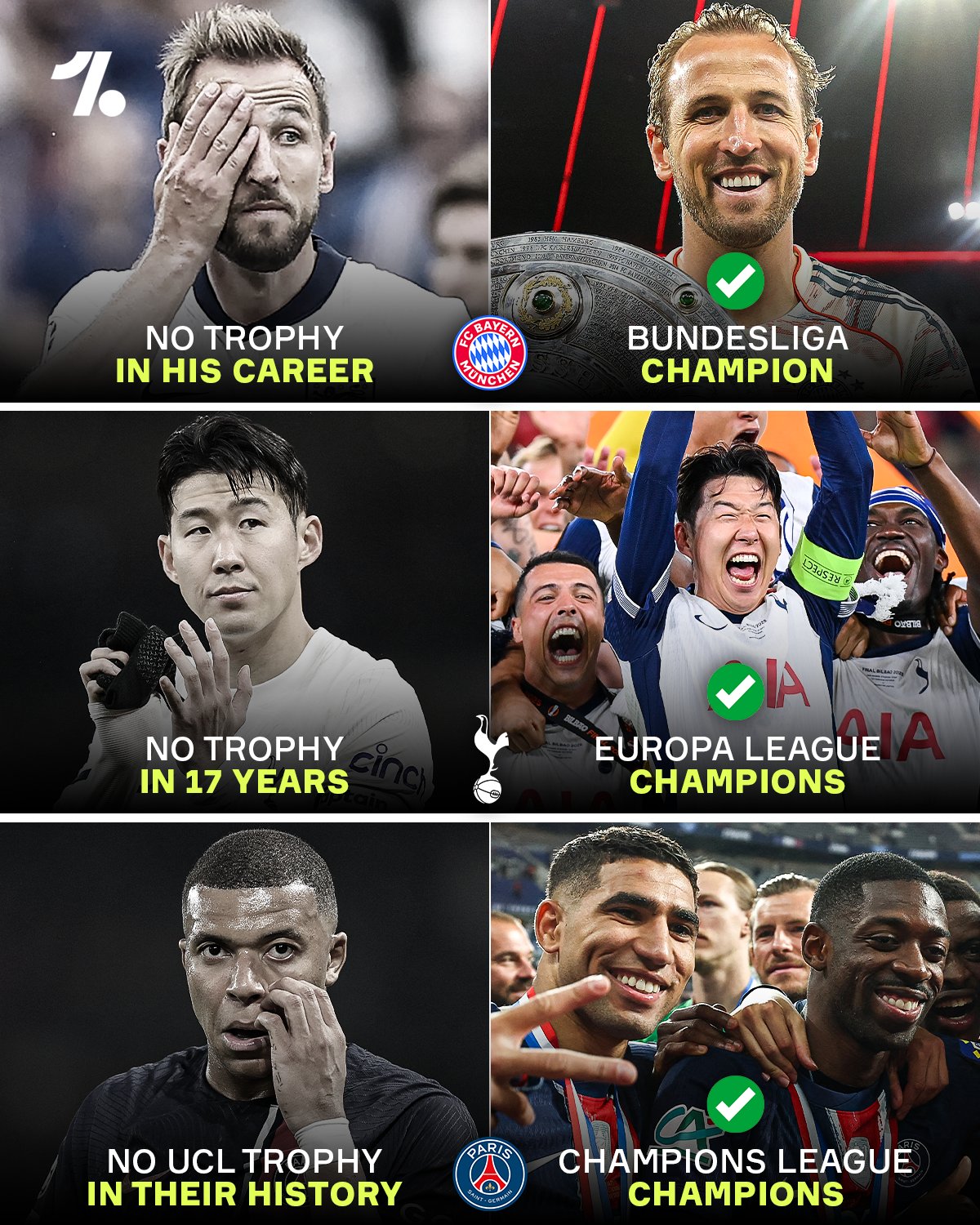 当然了,凯恩的老东家热刺,也在25年迎来了重要时刻--凭借24/25赛季的欧联杯冠军,作为英超Big6豪门的热刺也终结了球队17年无冠的情形、上次夺冠还是07/08赛季的英联杯冠军;