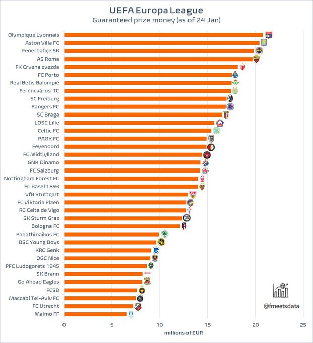 欧联赛场收入更高的则是法甲豪门里昂、2080万欧,更低的则是瑞典球队马尔默、650万欧;
