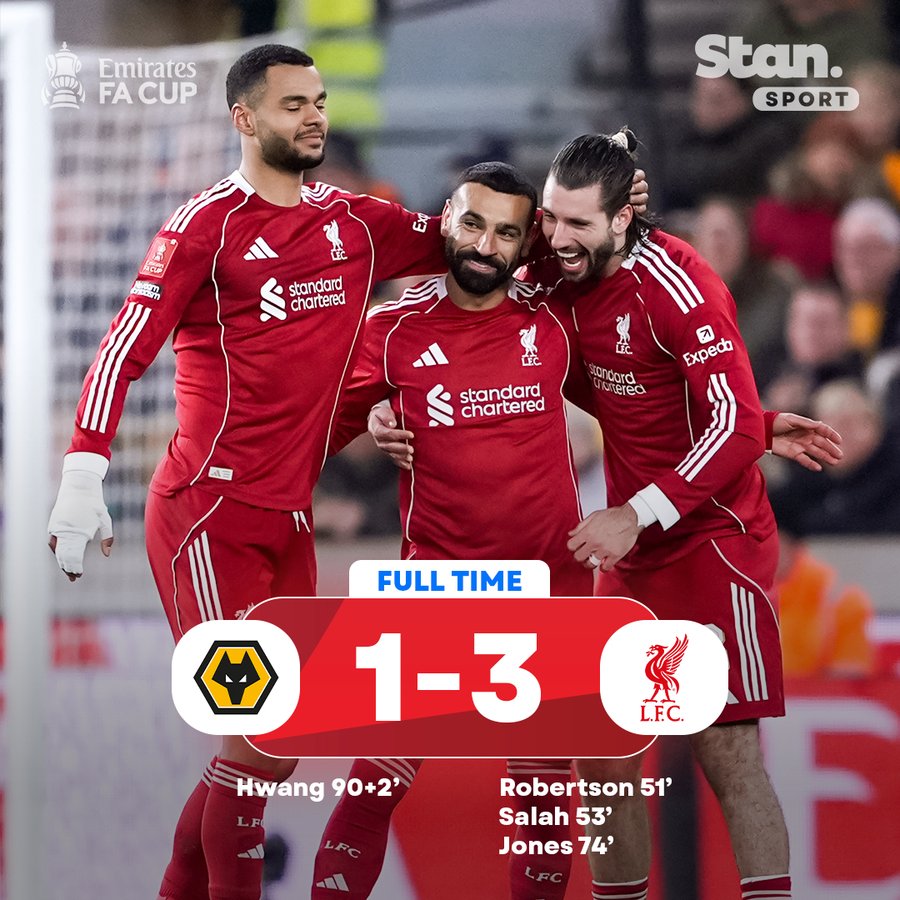 虽然第90+1分钟黄喜灿打进一球,但已经无伤大雅的情形,还是让利物浦凭借下半场29分钟之内的连进三球,以3-1的比分取胜狼队从而晋级足总杯1/4决赛的较量。