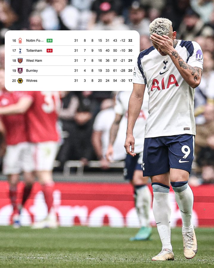 本场过后,热刺的确正在距离降级越来越近--31轮联赛不过30分的他们,目前落后第16位的诺丁汉森林两分,而也仅仅领先第18位的西汉姆联1分。