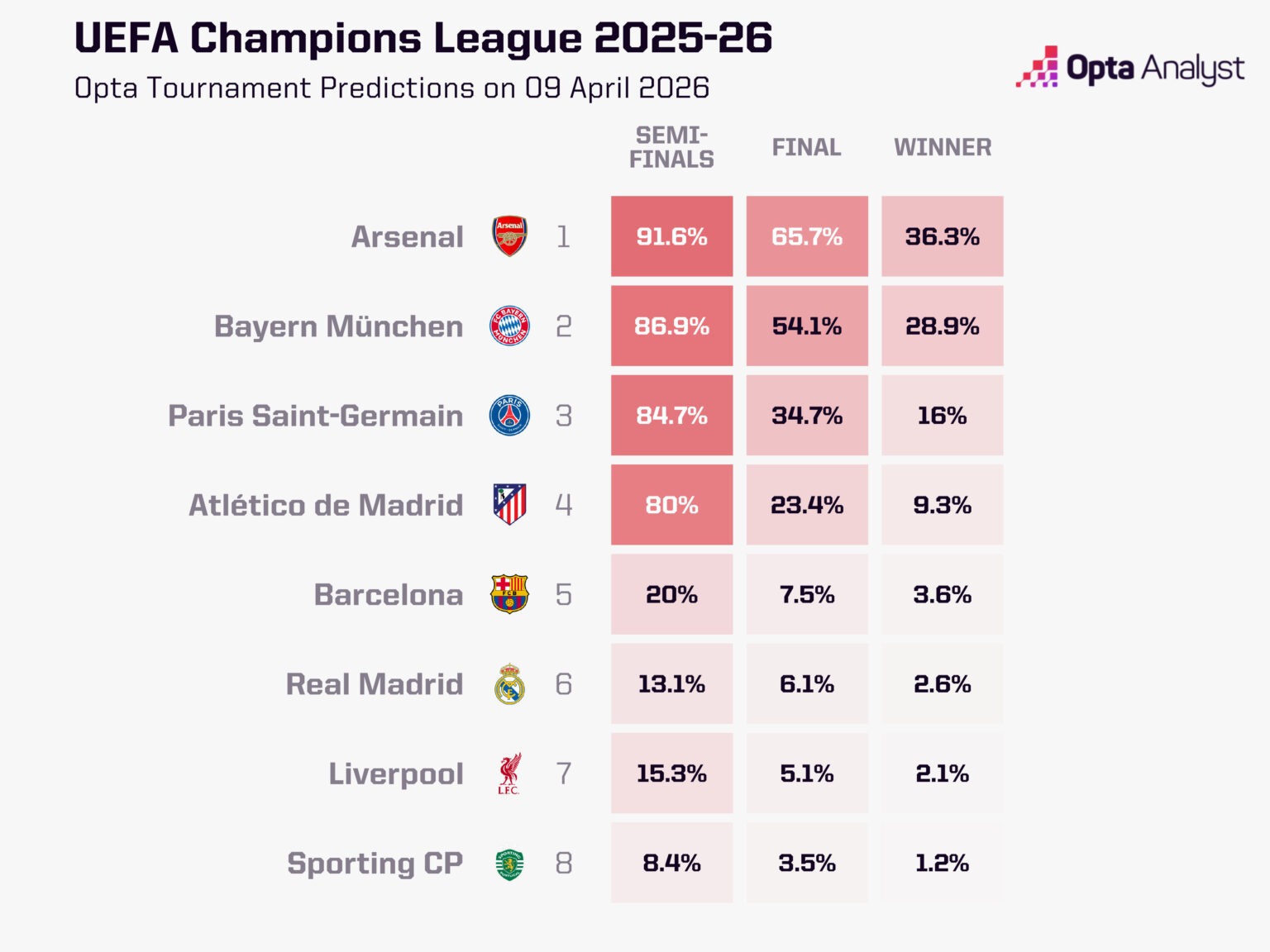 而在Opta目前给出的晋级半决赛的概率预测中,第一回合取胜的4支球队中,晋级概率更低的马竞都达到了80%的概率支持,阿森纳更是已经超过了九成、91.6%。